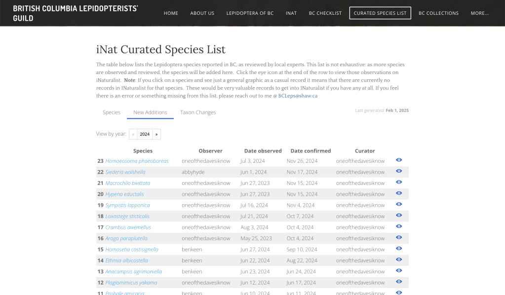 The idea to this tool was to automate the generation of a checklist of lepidoptera for British Columbia. The checklist would be a “live” list that reflects our current knowledge of the species in BC, rather than requiring people to rely on data that was published every few years, thus out of date. But broader than that, I wanted to create a script that can be used for any taxon and any place. In the era of iNat and citizen science projects, the wealth of data flooding in is staggering: keeping your head above water parsing the data for legitimate additions to your list is tough!