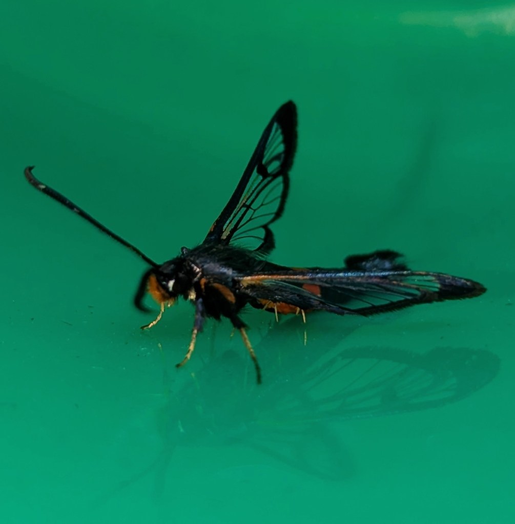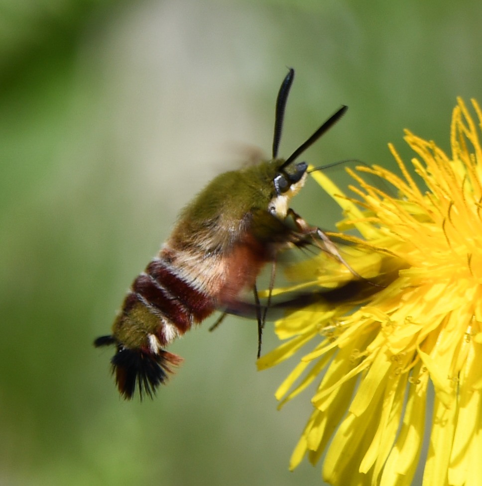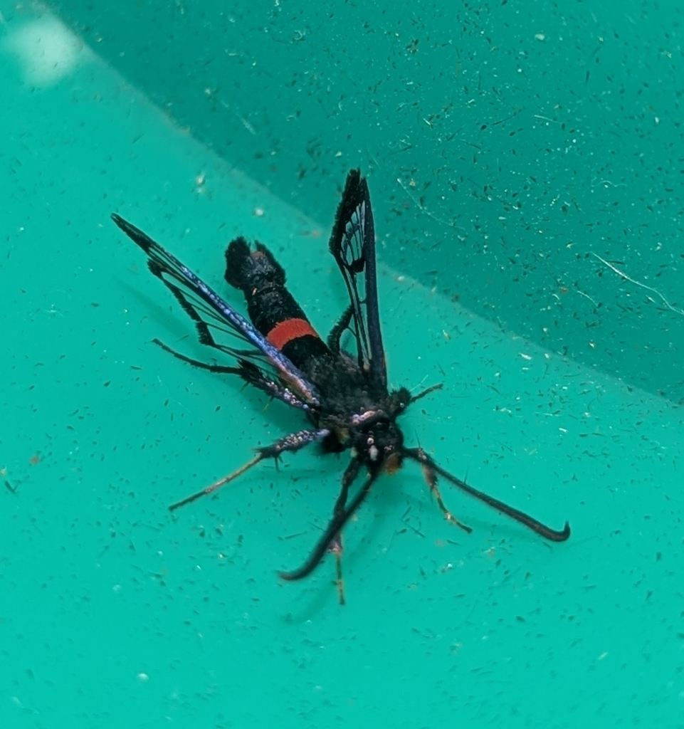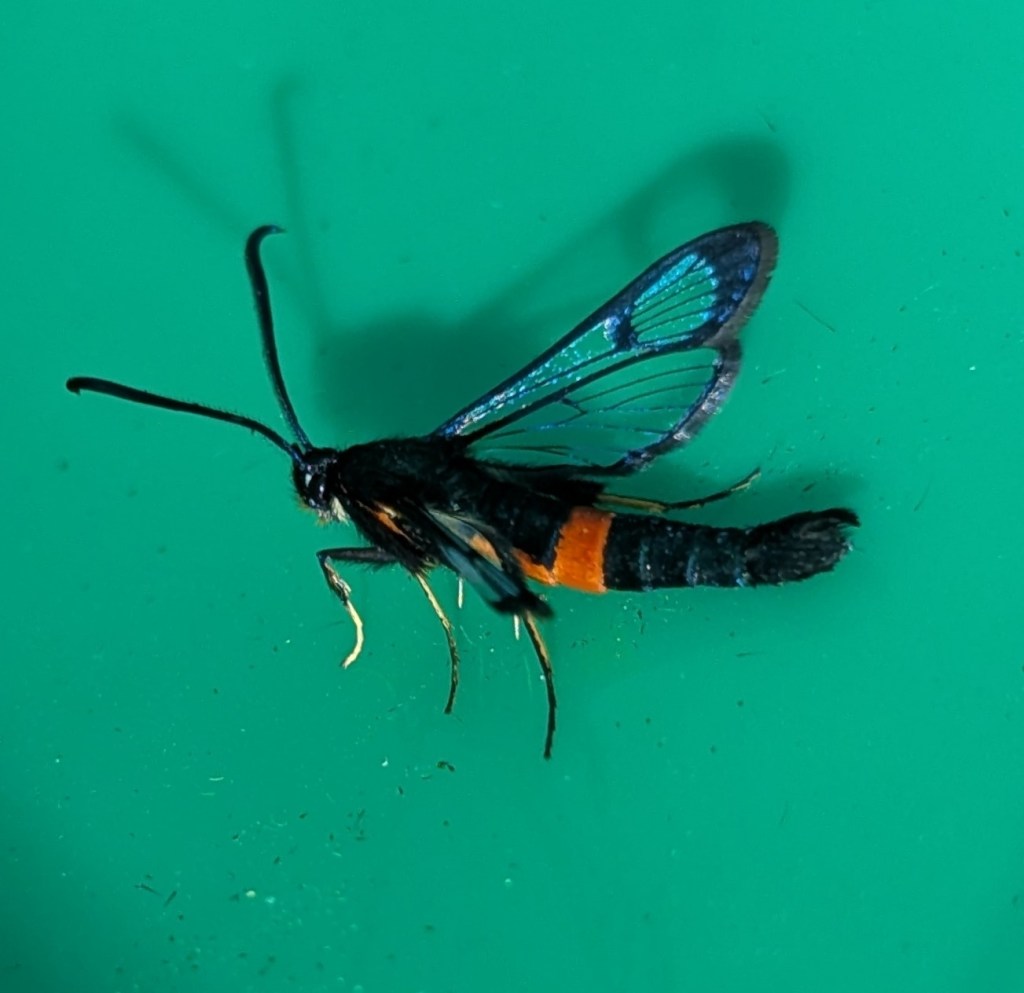 “Large” is clearly relative. The ones I saw struck me as distinctly small so I initially pegged it as the very similar S. myopaeformis. But Dave Holden noted the band of orange-red on the sides of the abdomen (which you can see in the third image) and the time of year the moth was flying – both pointed to this ID. I’d intended to collect one or two but they didn’t stick around beyond a day or two.